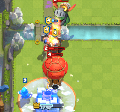 状況に応じて攻撃時にフリーズを使いましょう!この画像ではインフェルノドラゴンは盾の戦士でターゲットを上手くとられましたが、ラヴァとバルーンがタワーに到達しました。