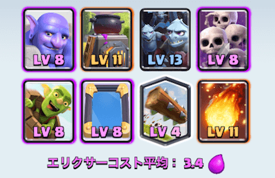 全壊を狙うというよりもキッチンやゴブリンバレルで確実にタワーのHPを削り勝ちを狙っていくデッキとなります。