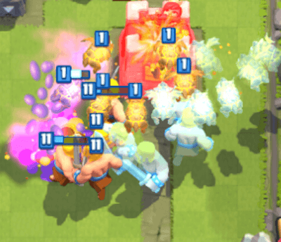 ボウラーなどでターゲットをとり、ゴブリンバレルでタワーを落としにかかりましょう。