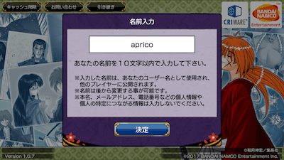 まずは名前の入力からです。10文字以内で名前を決めます。個人情報につながる名前は避けましょう。