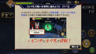 「士々札」は特殊攻撃・ステータス変化・回復など様々な補助効果があるようです。ソーシャルゲームならではの他のプレイヤーの士々札を連れて行く機能もあるので、ぜひ他のプレイヤーとつながりながら強くなっていきましょう。