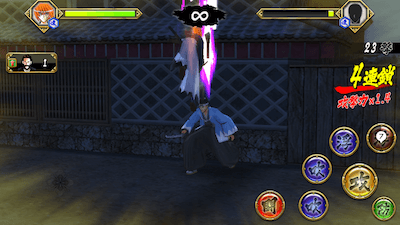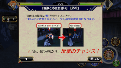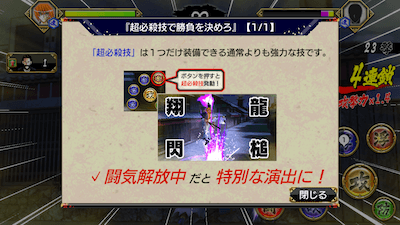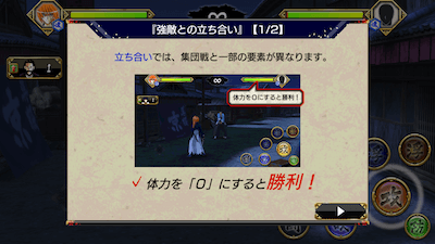 バトルでは「強敵との立ち合い」という1対1の決闘があります。これは体力を0にすると勝利となります。強敵との立ち合いでは少し画面が変わってきます。