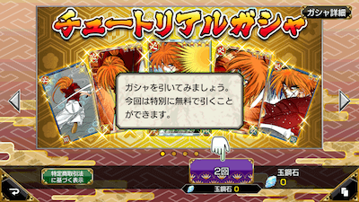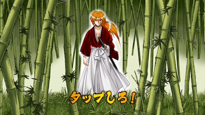 ガチャの演出です。漫画でもあった剣心が竹林にいる場面でタップすることでカードが引けます。