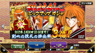 ガチャにはいくつか種類があります。今公開されてるガチャのひとつが「緋村剣心ピックアップガチャ」です。検診の技札の排出率が3倍となっています。剣心を強化したい場合はおすすめのガチャです。