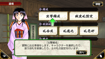 道場では出撃の編成や戦友札の設定や札合成・進化・売却といったことが可能です。ソーシャルゲームでいういわゆる「デッキ編集」「カード強化」「カード進化」「カード売却」ですね。それが「道場」の画面から行えます。