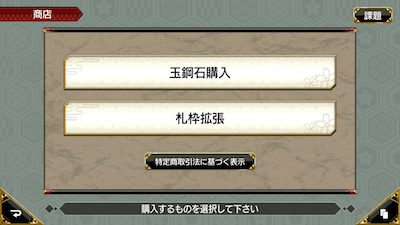 商店では「玉鋼石」の購入と札枠拡張(所持枚数)を行えます。玉鋼石はガチャを引けるアイテムなので、ガチャをがんがん引きたい人は購入を行いましょう。