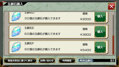 玉鋼石は一気にたくさん買えばボリュームディスカウントが効いてきます。MAXで5,400円で90個の玉鋼石が買えます。 (MAXだと玉鋼石1個あたり60円ですね。)