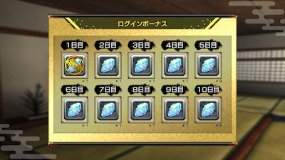 ログインボーナスももちろんあります!!まだ1日目以降はなぞですが、毎日ログインして、ボーナスをもらいましょう!見た感じ10日リセットですかね?