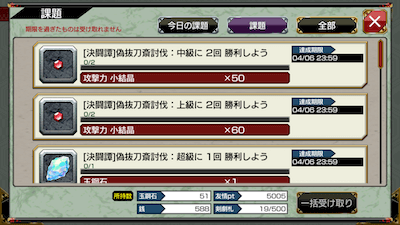 課題は ・今日の課題 ・課題 の2種類があります。今日の課題は毎日かわるようです。課題をクリアすると、アイテムがもらえますのでぜひ課題を狙ってクリアしましょう。玉鋼石をもらえる課題もあるようです。玉鋼石をためてガチャを引こう!