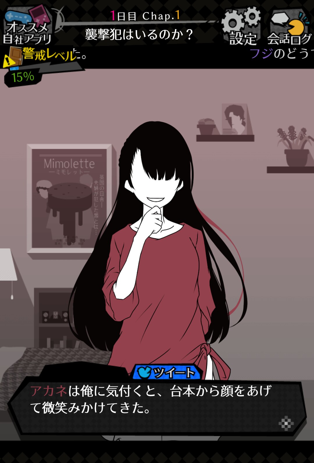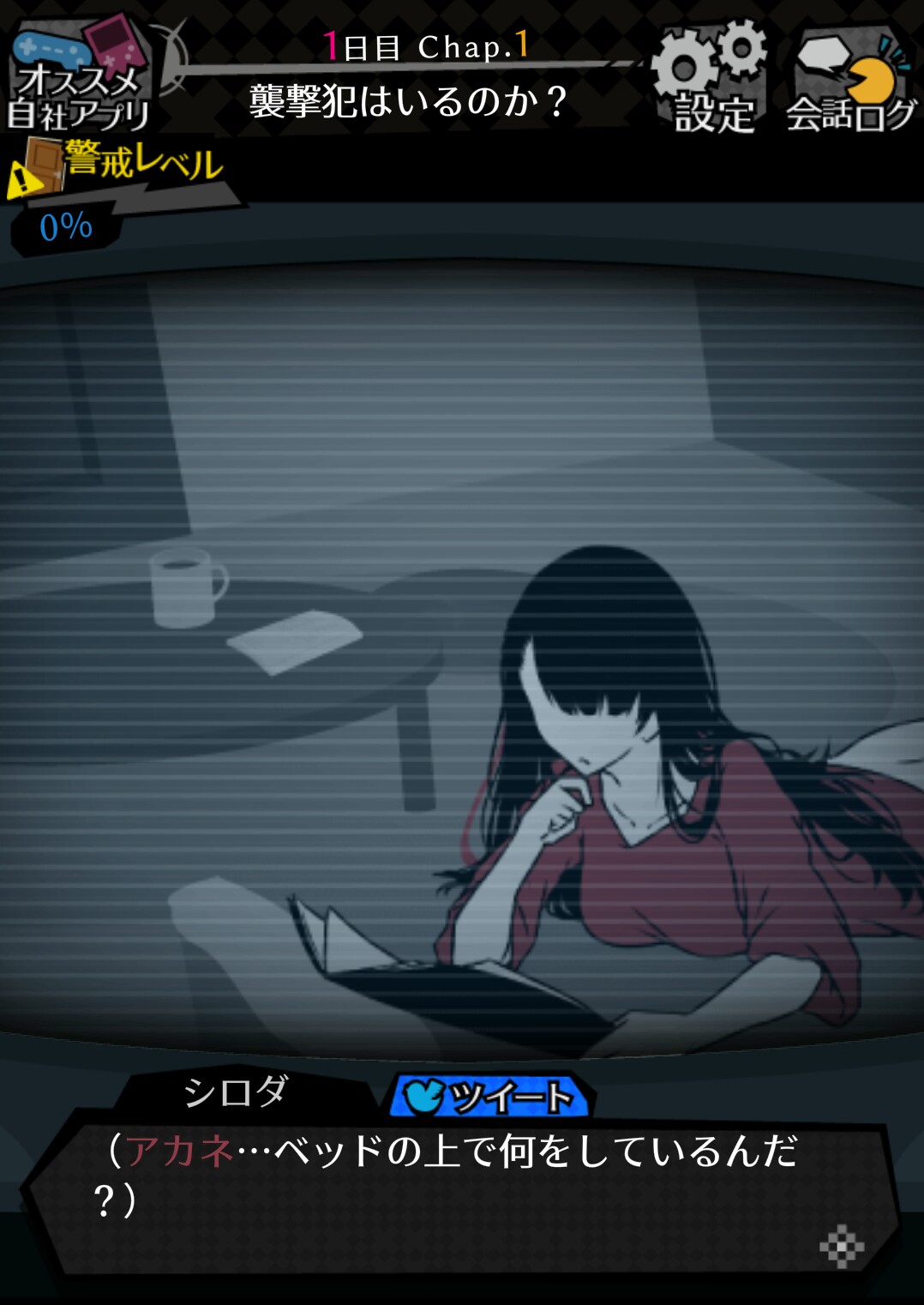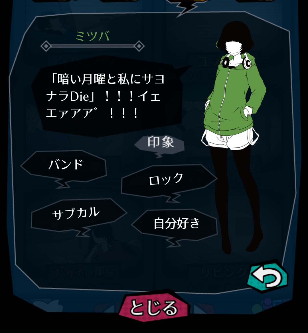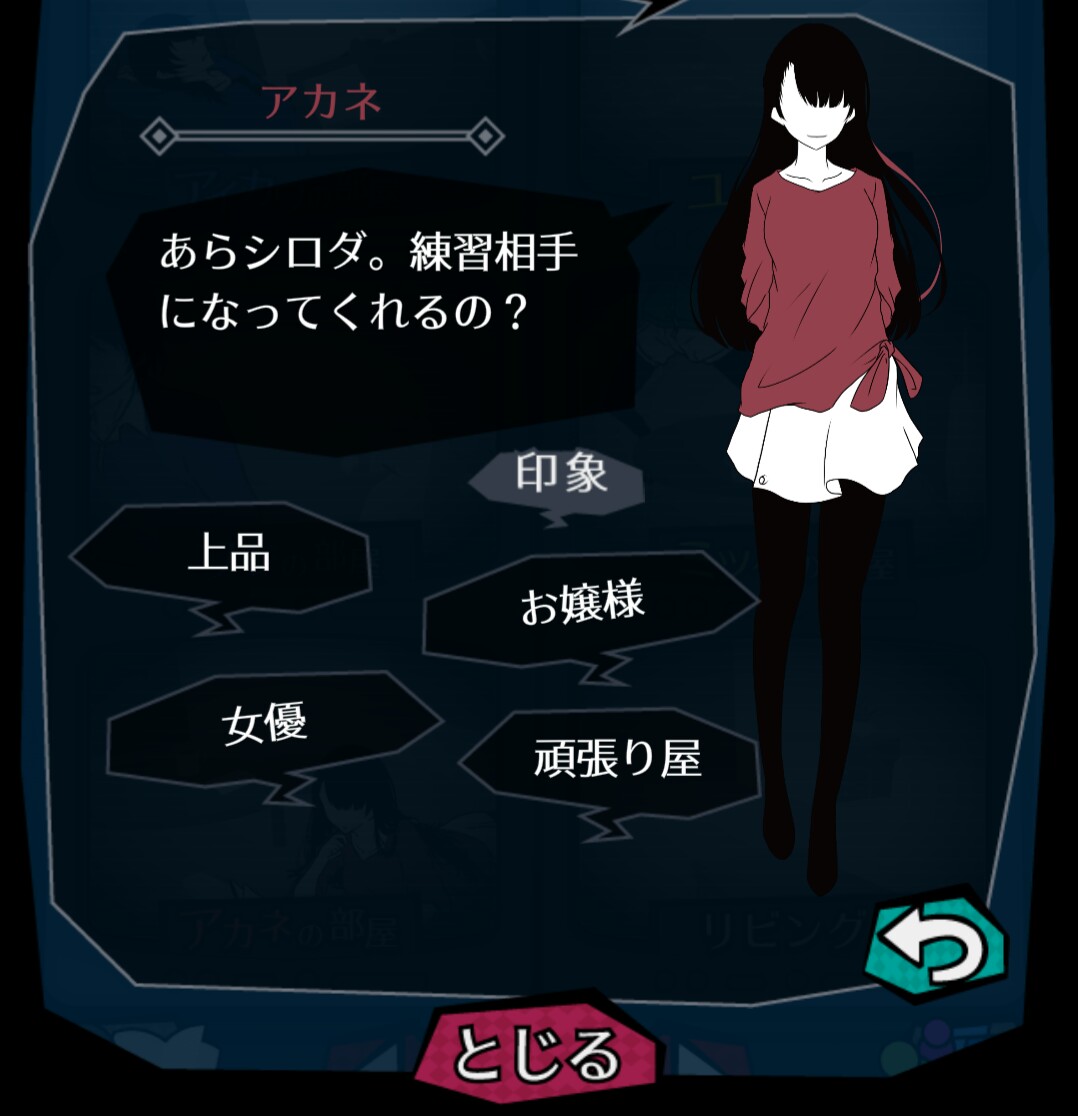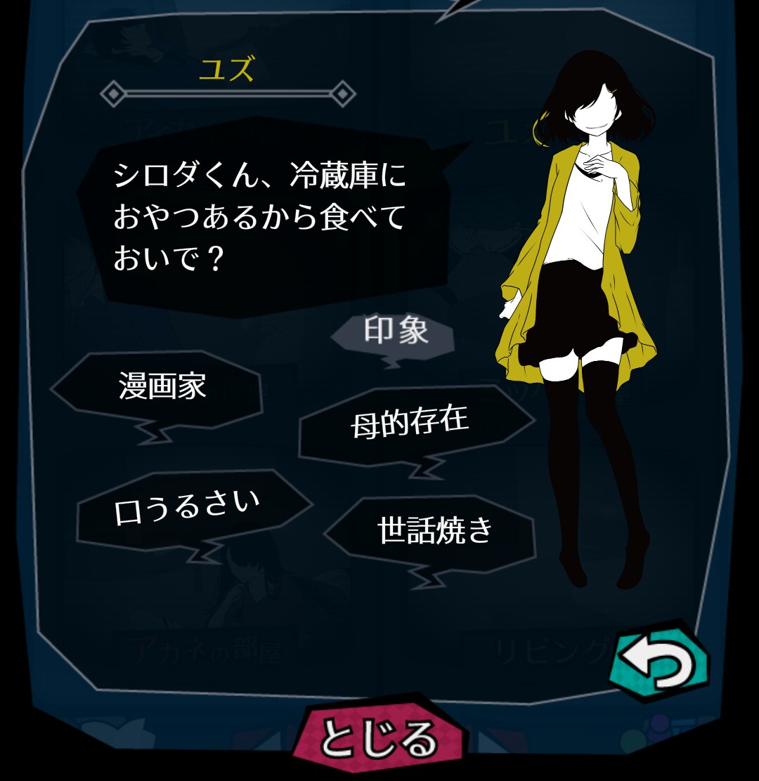 「調べに向かう」で訪れたアカネの部屋。 彼女からはどんな情報を得ることが出来るのでしょうか…? 住人たちから得られる情報も、重要です。ときには「調べに向かう」で攻略していきましょう。