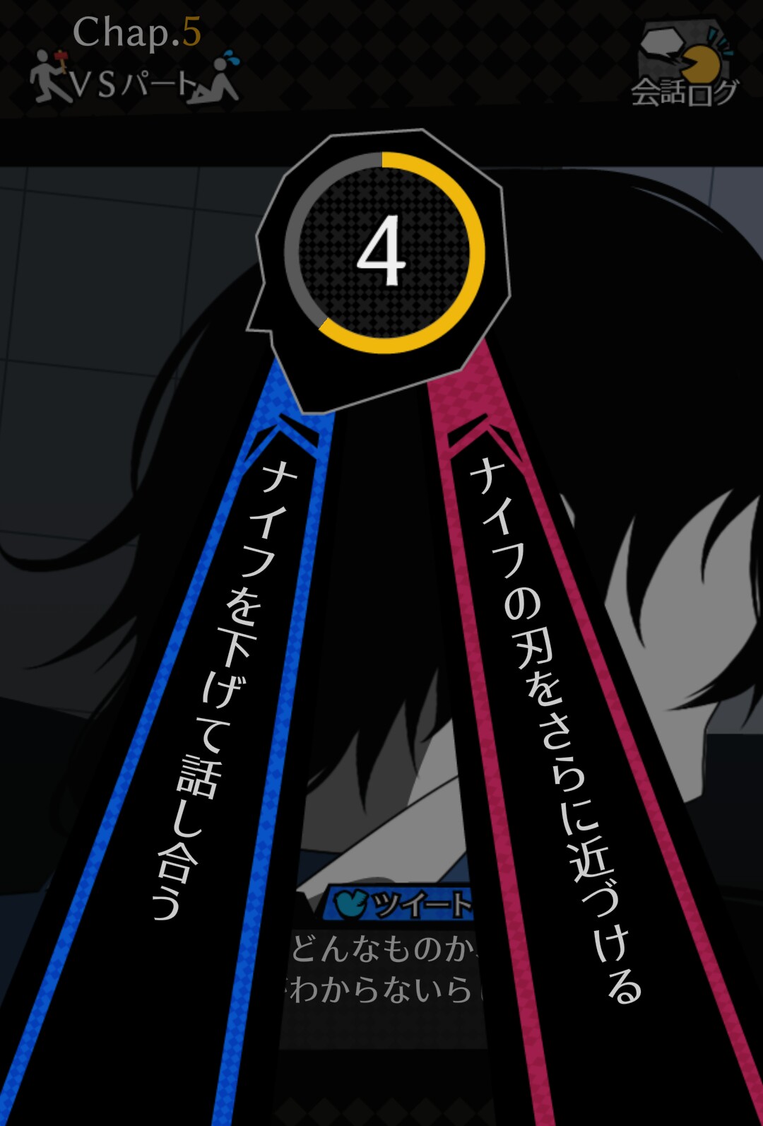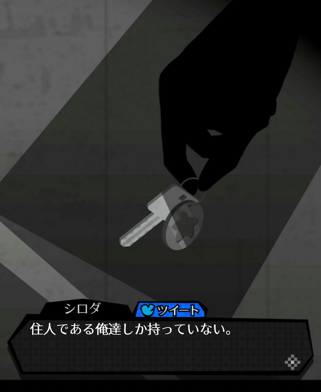 「事前対策パート」で犯人の行動を予測したら、次はいよいよ犯人と対決します。 犯人がシロダを殺す前に、犯人を追いつめます! この「VSモード」でも選択肢があり、間違えるとバッドエンド。シロダが殺されてしまいます! また、「VSモード」の選択肢を選ぶ時間は5秒間しかありません。こちらも「警戒レベル」と同じく秒を過ぎてしまうと…。 犯人と対決、というような重要な場面です。慎重に選択肢を選びたいところですが、そうもいきません。 時間と選択肢、両方に気をつけながら「VSモード」を攻略していきましょう。