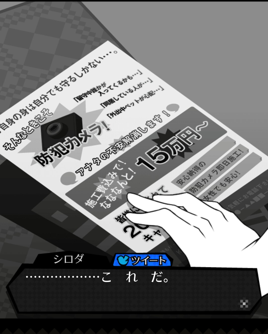 身の危険を感じたシロダは、たまたまあった「監視カメラ」の広告を見て、ひらめきます。「これだ」と。