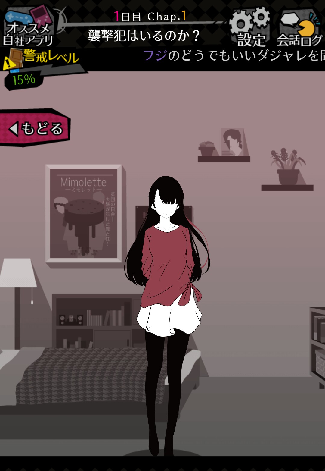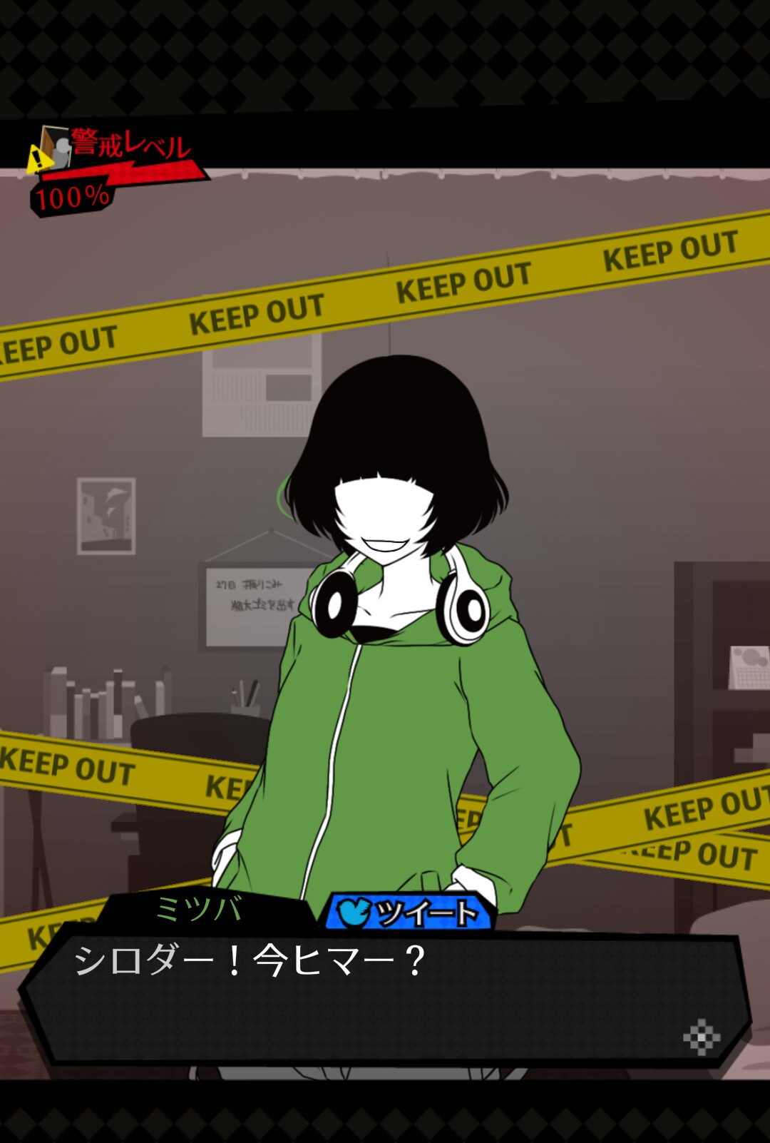 「調べに向かう」を選択し、部屋を訪れると、少しずつ住人たちの「警戒レベル」が上がっていきます。 「警戒レベル」が高いと、「住人たちの誰かがシロダの部屋を訪れます」! また、「警戒レベル」は高ければ高いほど、住人たちの誰かがシロダの部屋を訪れる確率が高くなります。 「監視」や「調べに向かう」で情報を集めることもよいですが、住人たちの急な来訪には十分に注意しましょう!