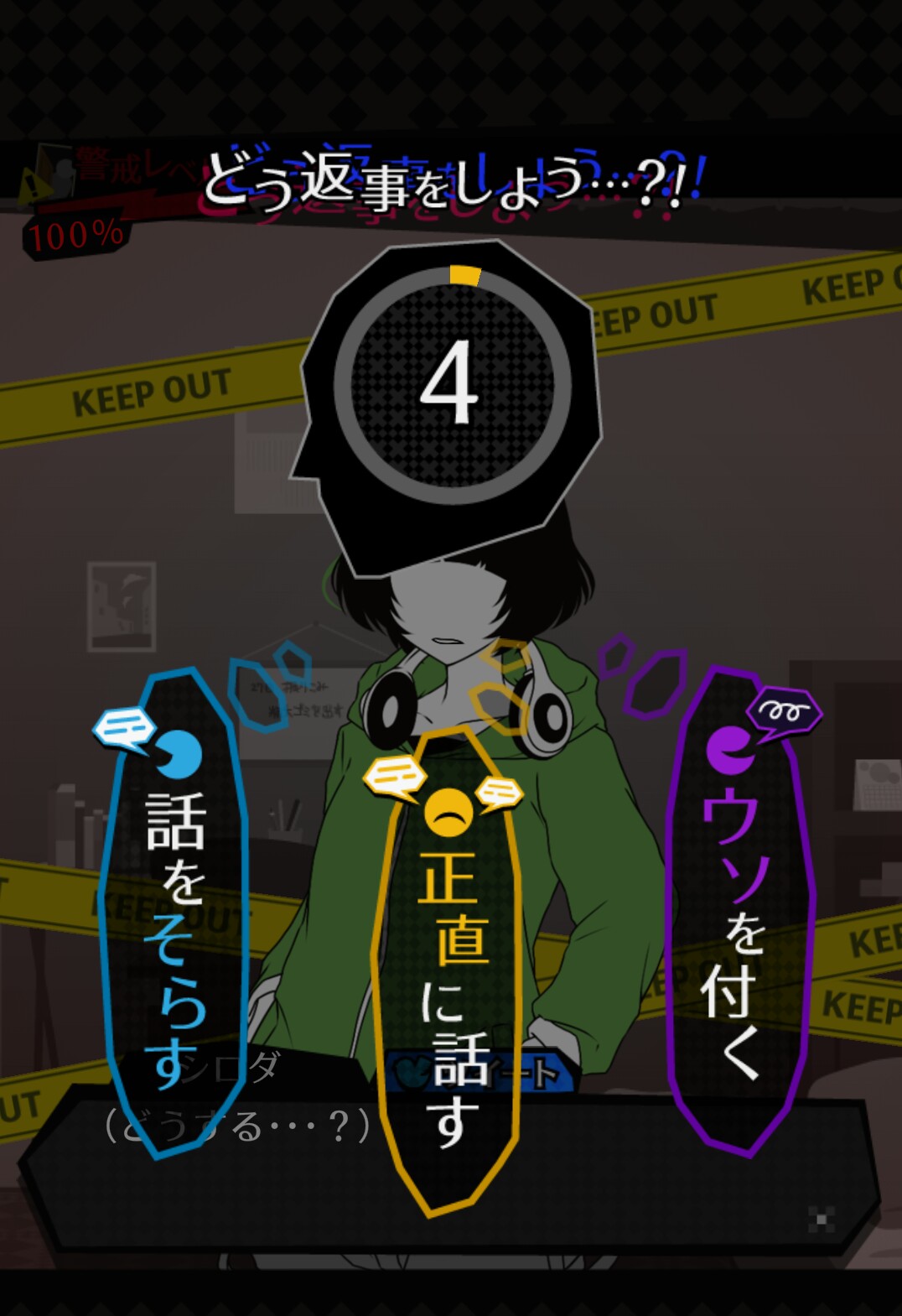 「警戒レベル」が高くなり、シロダの部屋に住人の誰かが訪れた場合、「シロダが何をしていたのか」を問われます。 そのときにシロダが答えられる選択肢は3つ。「ウソをつく」「正直に話す」「話をそらす」の3つです。 この選択肢には1つNG選択があり、それぞれ住人1人1人によって答えが違います。 しかも、選択を選ぶ時間は5秒間しかありません!5秒を過ぎると、自動的にゲームオーバーです。時間も気にするようにしましょう。 住人の性格をよく見極めて、部屋に訪れた住人に「監視」がバレないように選択肢を選んで攻略していきましょう。