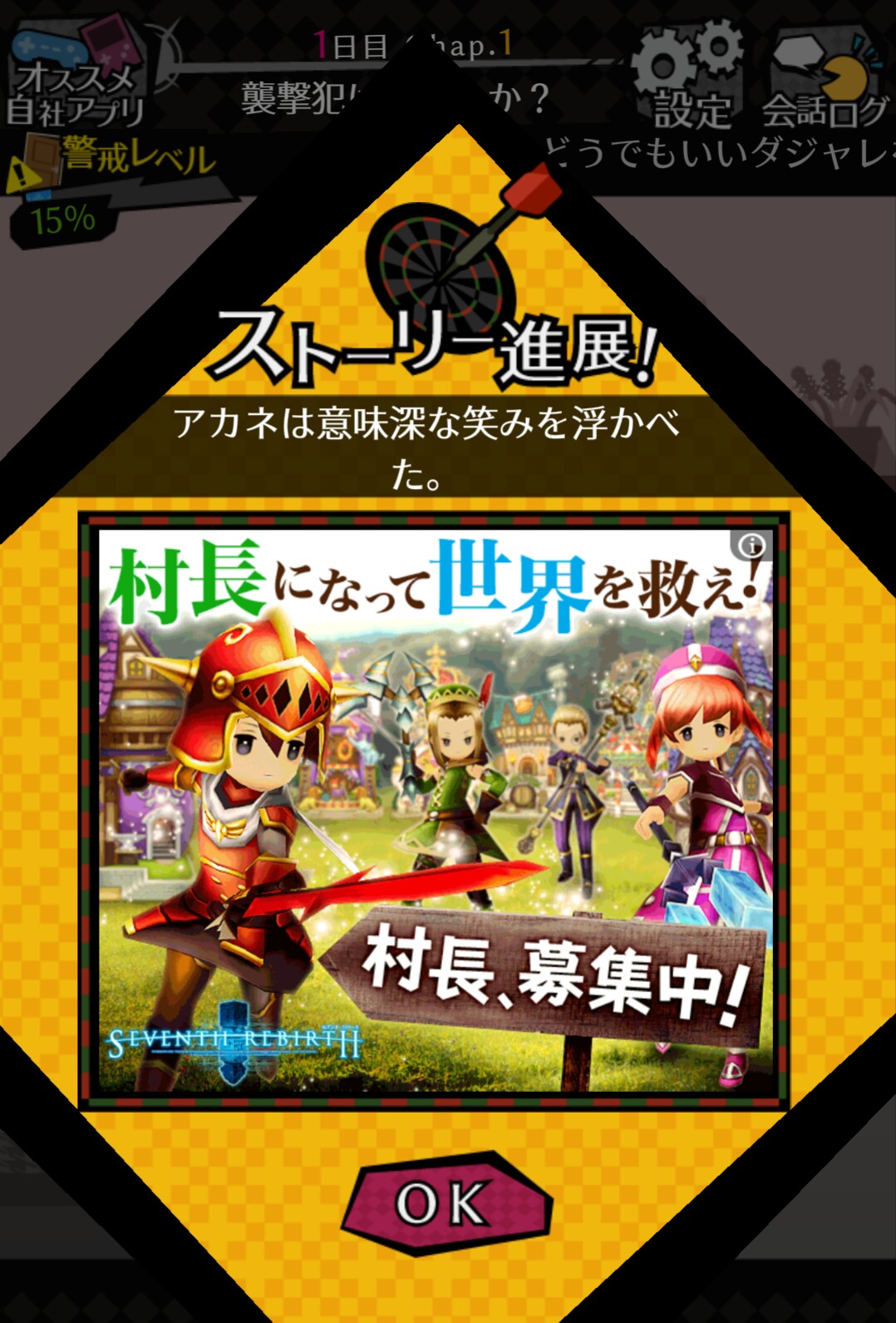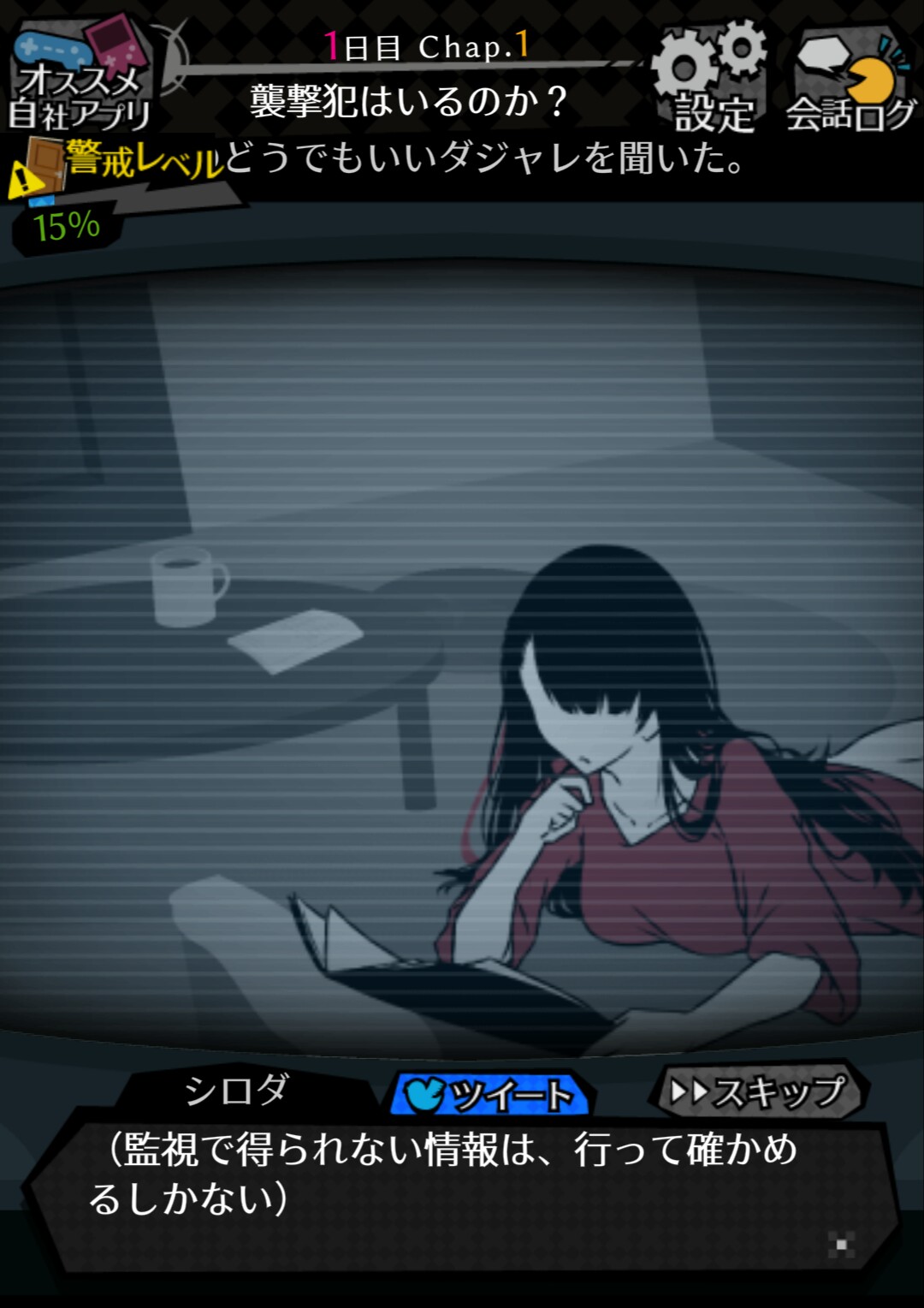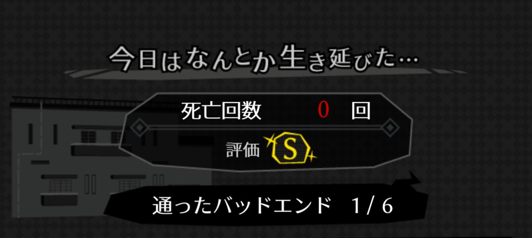 犯人の計画を阻止すると、1日が終わります。 よく生き延びた。やったねシロダ!と思わず嬉しくなってしまいます。 「監視」をして、シロダの命を救いましょう!