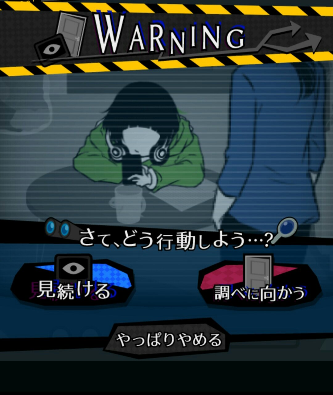 部屋の様子や住人の様子を「監視」していると、ときにはシロダの運命を左右するような選択を迫られる場面があります。 この「WARNING」と、画面に表示されたときは要注意! 選択を間違えると、シロダが殺されてしまいます!! 慎重に考えて、選択しましょう。