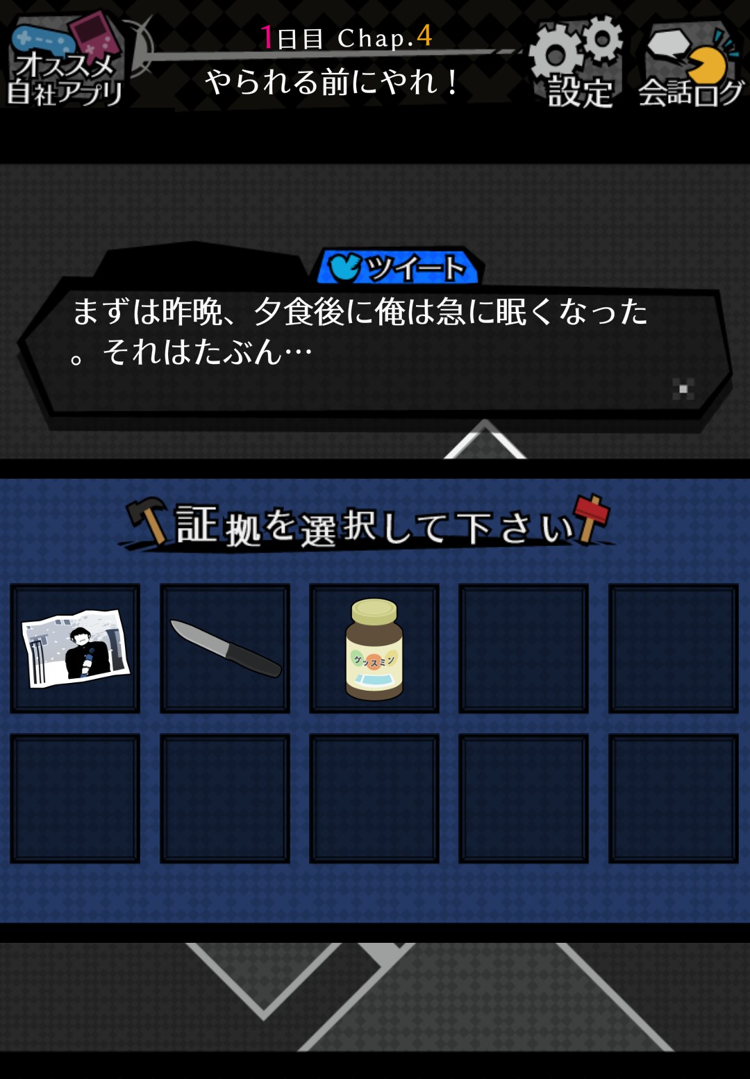 「犯人を指定」したら、次は「事前対策パート」に入ります。 「事前対策パート」では、今まで集めた情報や証拠を元に、犯人の行動を予測し、シロダを殺そうとするという、犯行を阻止します! 今まで集めた「証拠」や「情報」があればきっと分かるはず。 答えとなる「証拠」や「情報」を選択して、「事前対策パート」を攻略していきましょう。