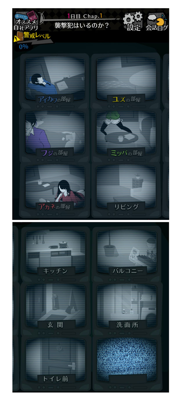 まずは、シロダが設置した「監視カメラ」でルームメイトたちの部屋や共用の部屋などを、「監視」します。 「監視」できる場所は、「アイカワの部屋」「ユズの部屋」「フジの部屋」「ミツバの部屋」「アカネの部屋」「リビング」「キッチン」「バルコニー」「玄関」「洗面所」「トイレ前」の11箇所です。 「監視」したい場所をタップすることで、住人の様子や部屋の様子を覗き見ることができます。 住人のいない場所を「監視」することで、情報が得られることも…!?