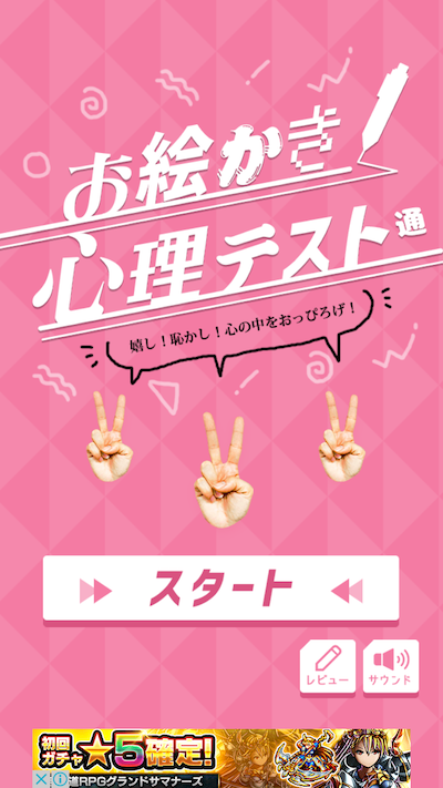 「桃のサイズは〇〇〇と一緒!?㊙お絵かき心理テスト!通」をご紹介します!桃のサイズと何が一緒なんだ!!! 気になりますねw 使い方は お絵かき!心理テストのアプリであなたの心マルハダカ と使い方はほぼおなじとなっていますが、改めてご紹介していきます。 それではさっそくアプリを立ち上げて「スタート」ボタンからアプリを遊んでみましょう!