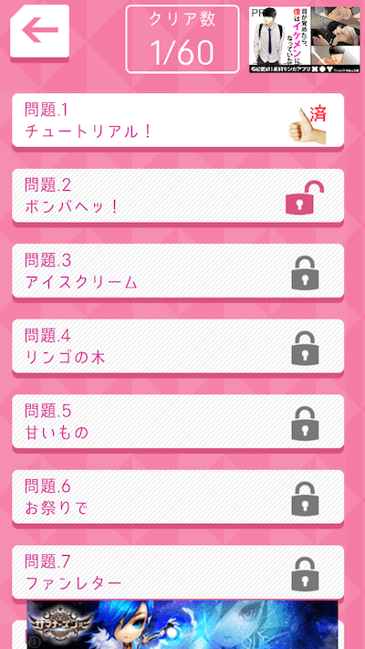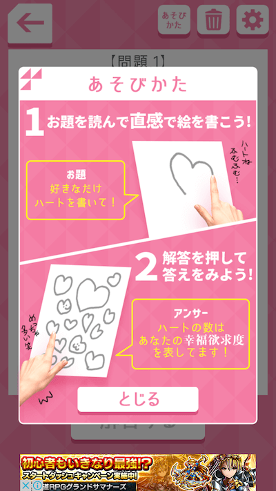 問題の一覧ページです、今回は全部で60問絵を描いてわかる心理テストが用意されています。問題.1が最初答えられる状態で、クリアをしていくと、他の問題も開放されていきます。 さっそくチュートリアルを試しましょう。