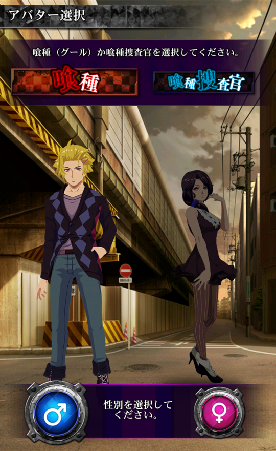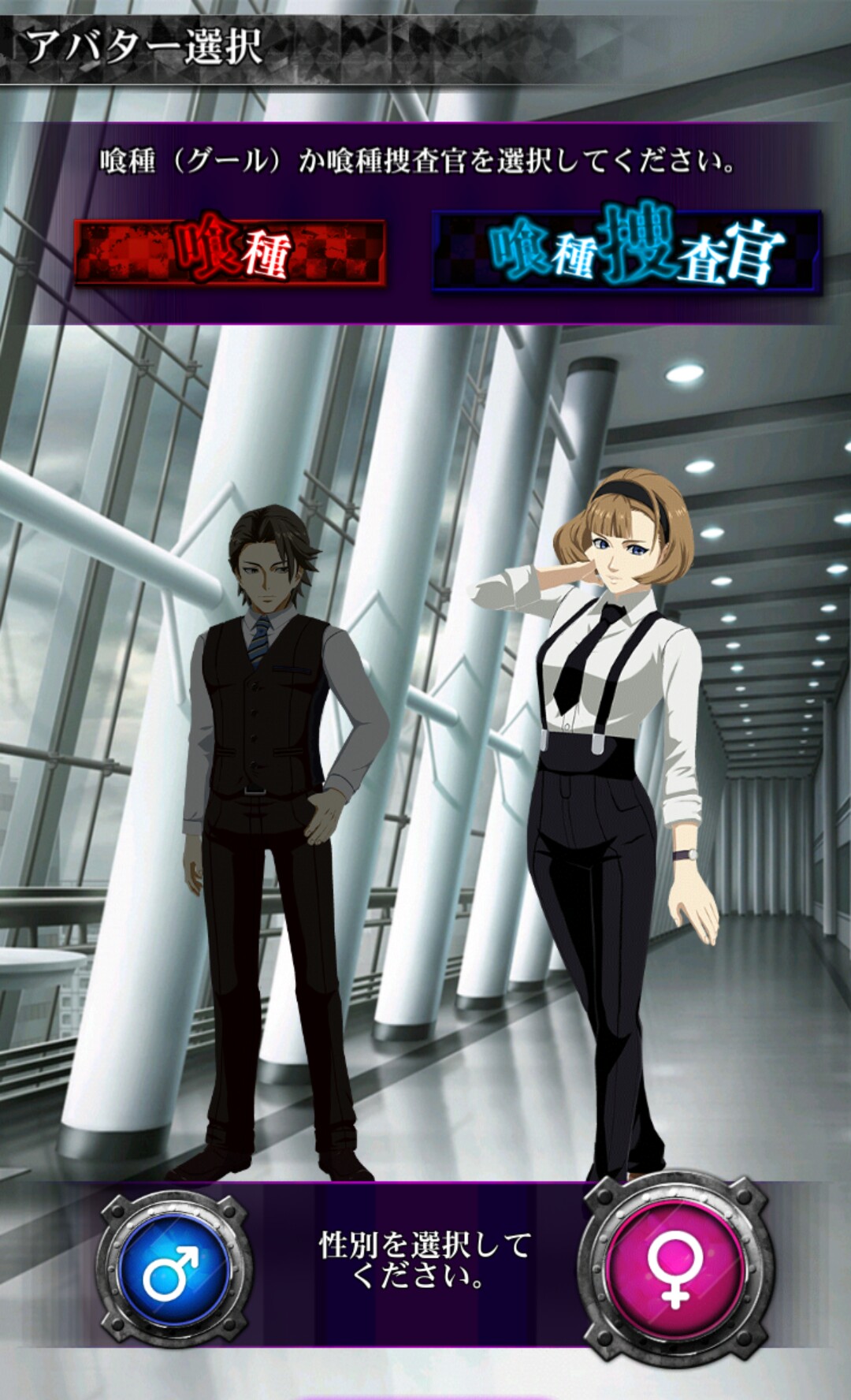 【喰種】とは、人の姿をしながら人を“食料”として喰う者たちです。 【喰種】を選択すると、「男」「女」どちらかの性別でアバターを作成するか選択できます。