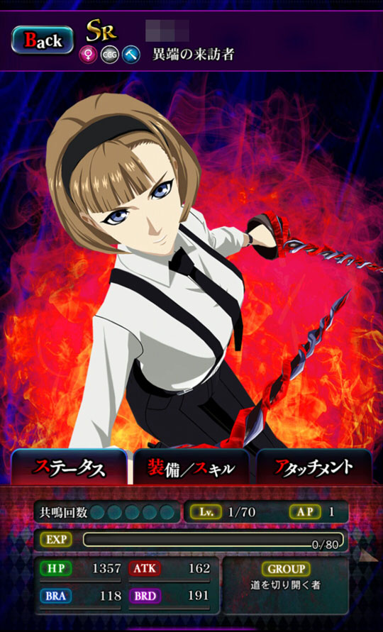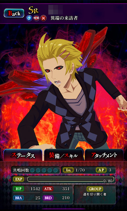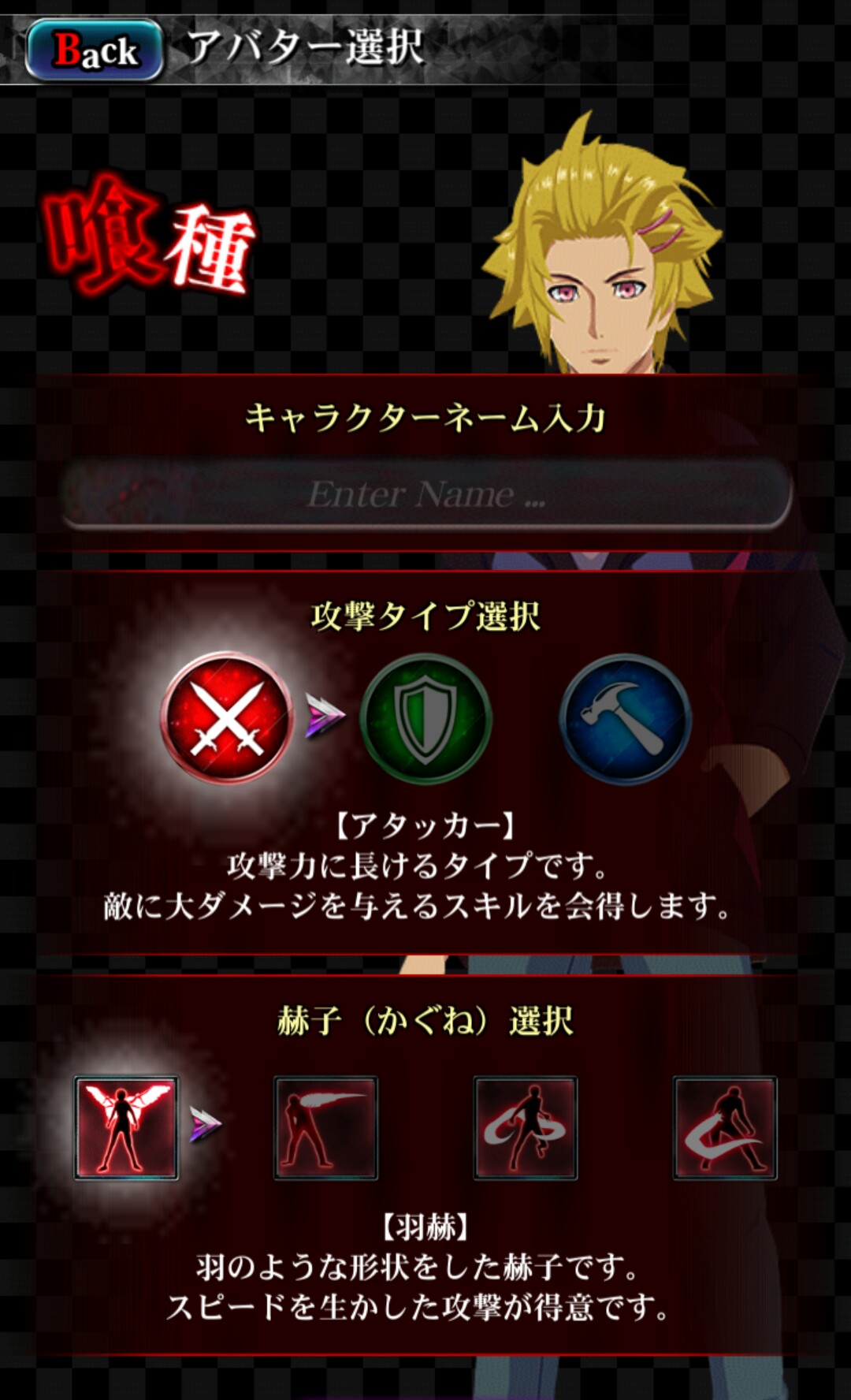 「攻撃タイプ」と「赫子」を選びます。組み合わせは自由です! 攻撃タイプは以下の3種類です。 【アタッカー】攻撃力に長けるタイプ。敵に大ダメージを与えるスキルを会得します。 【ディフェンダー】ブレイク耐久力に長けるタイプです。味方の能力を向上させるスキルを会得します。 【ブレイカー】ブレイク力に長けるタイプです。敵の能力を低下させるスキルを会得します。 赫子は以下の4種類です。 【羽赫】羽のような形状をした赫子です。スピードを生かした攻撃が得意です。 【甲赫】肩甲骨の下から突出する金属質の赫子です。スピード感に欠けますが耐久性に優れます。 【鱗赫】腰から生えるうろこ状の赫子です。赫子自体は脆いが攻撃性に優れます。 【尾赫】尾てい骨付近に生える赫子です。攻守共にバランスがとれたタイプです。