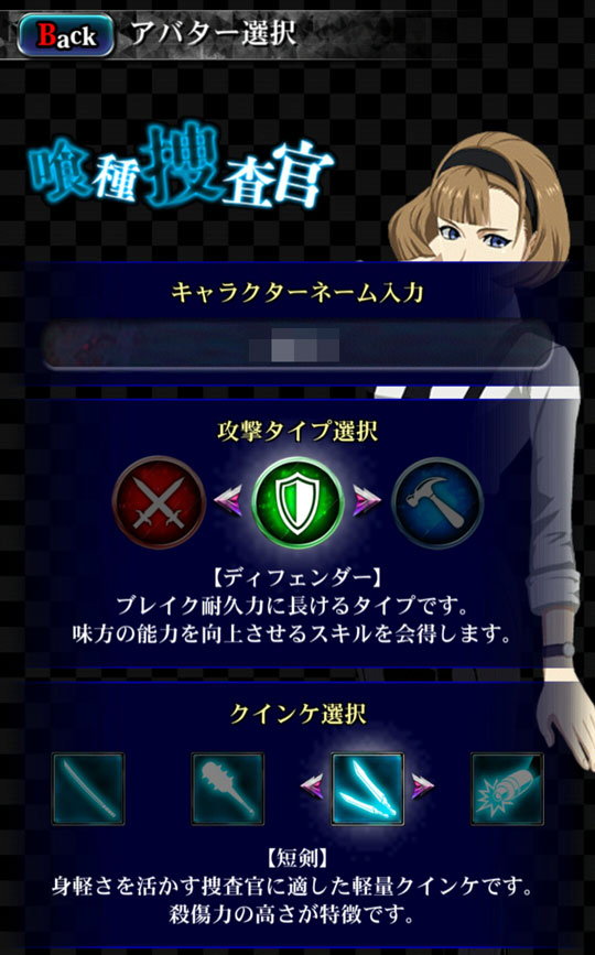 「攻撃タイプ」と「クインケ」を選びます。組み合わせは自由です! 攻撃タイプは以下の3種類です。 【アタッカー】攻撃力に長けるタイプ。敵に大ダメージを与えるスキルを会得します。 【ディフェンダー】ブレイク耐久力に長けるタイプです。味方の能力を向上させるスキルを会得します。 【ブレイカー】ブレイク力に長けるタイプです。敵の能力を低下させるスキルを会得します。 クインケは以下の4種類です。 【剣】オートゾックスな接近用のクインケです。耐久性の高さが特徴です。 【鈍器】叩き潰すことを目的とした重量級クインケです。敵の体制を崩しやすい特徴があります。 【短剣】身軽さを活かす捜査官に適した軽量クインケです。殺傷力の高さが特徴です。 【銃】後方支援を行う捜査官必携のクインケです。敵の体制を崩しやすい特徴があります。