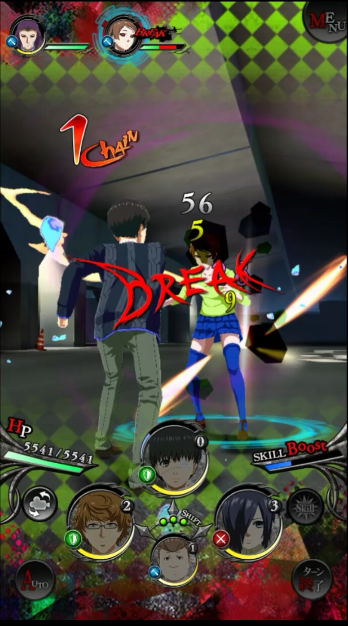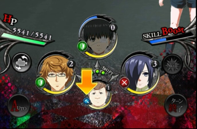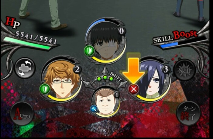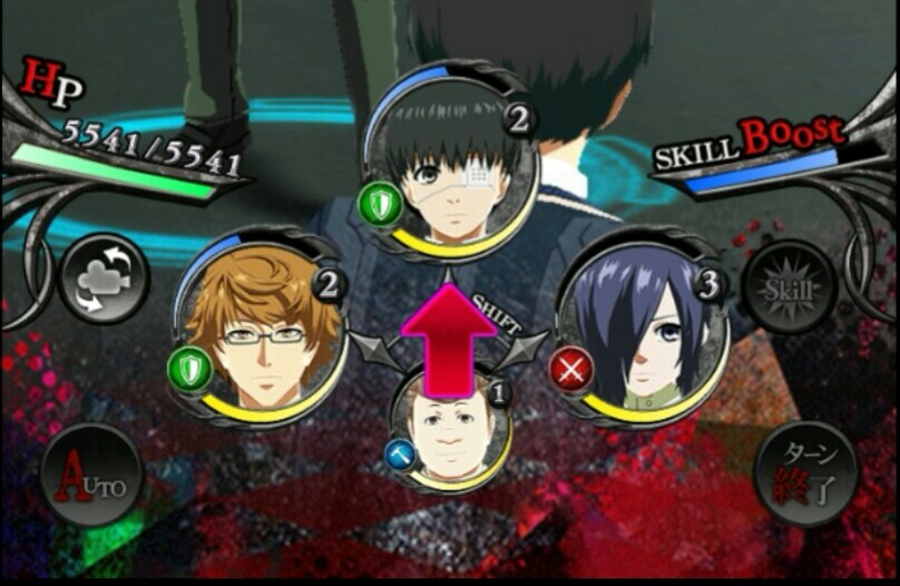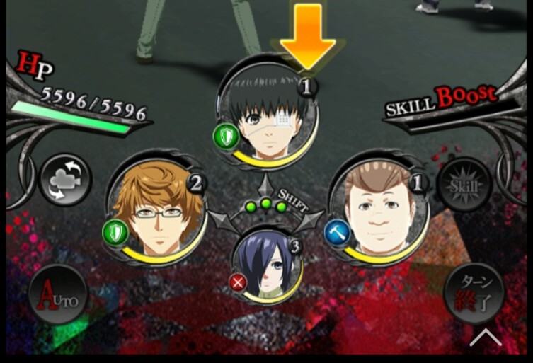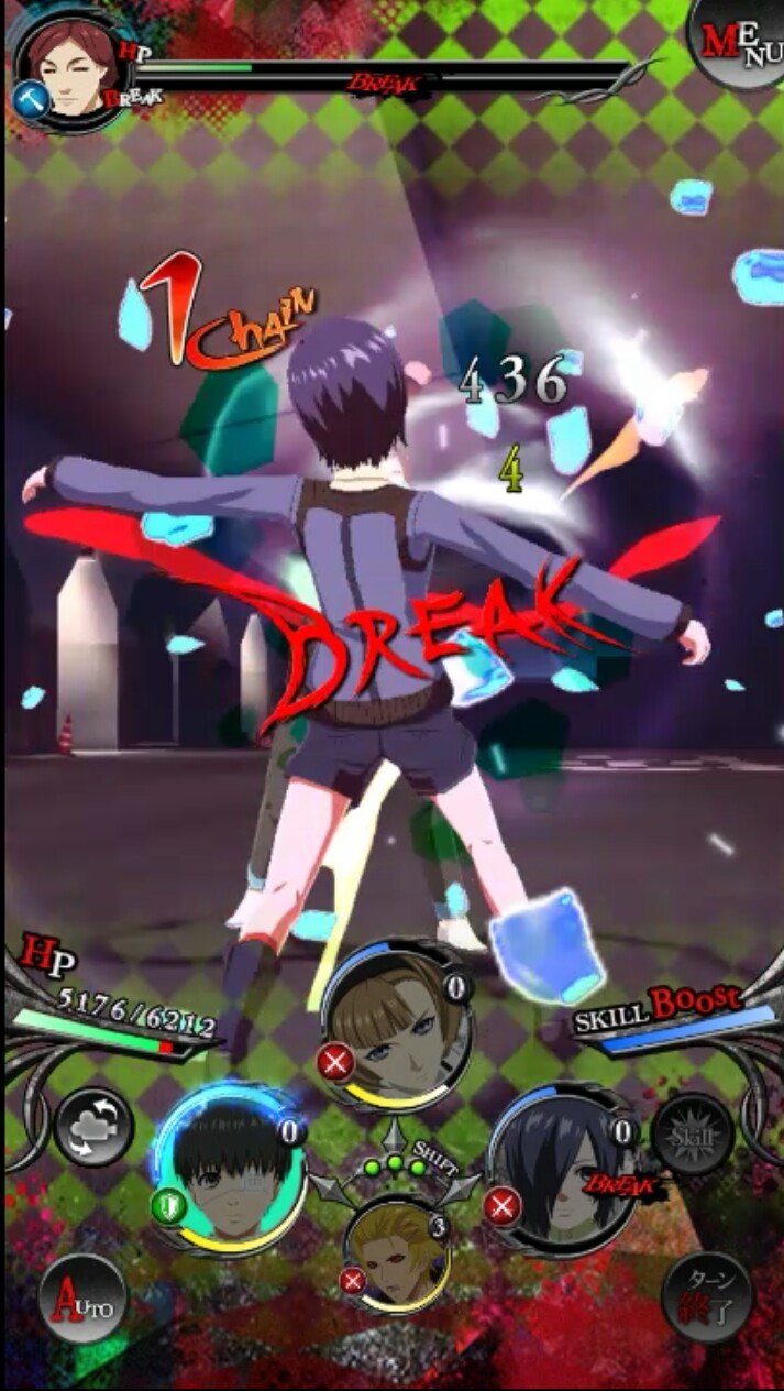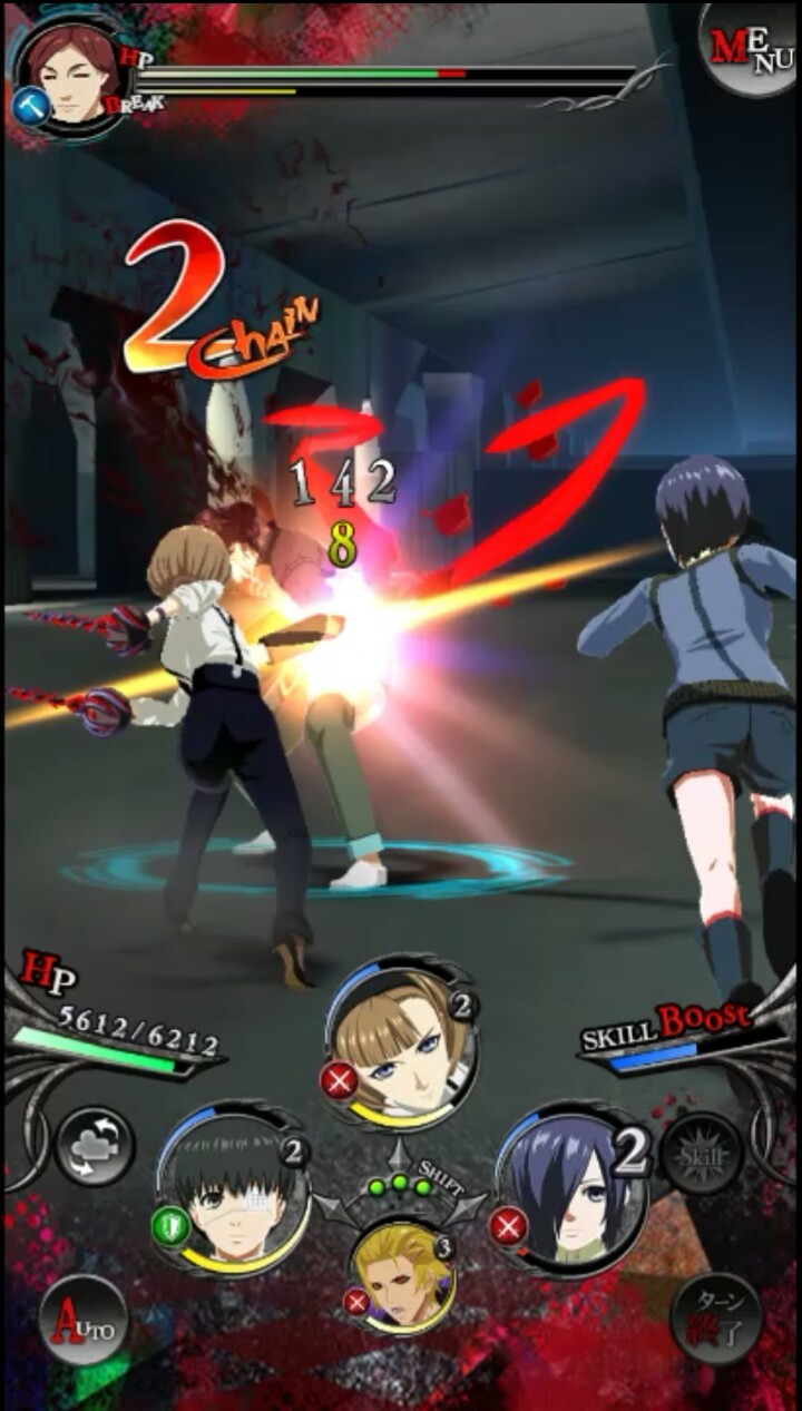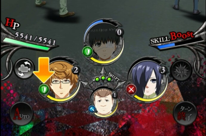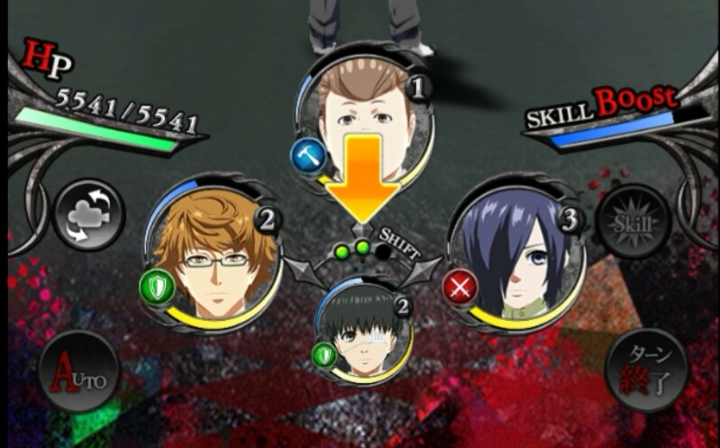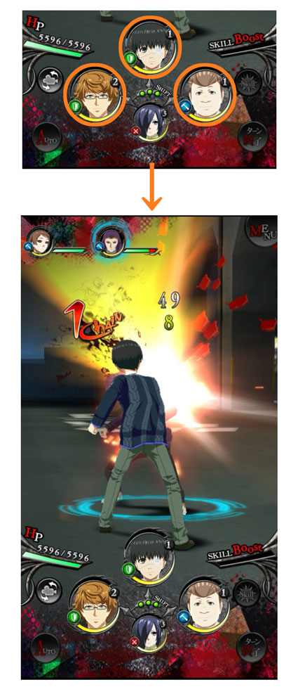 『東京喰種 :re invoke』のバトルは、ターン制RPGに爽快感を吹き込んだタップバトルです。 自キャラクターの向こう側にいるキャラクターを全員倒すと、バトル終了です。