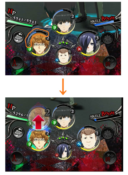 「シフト」の使い方は、後衛キャラのアイコンを入れ替えたいキャラクターに向かって上にドラックします。