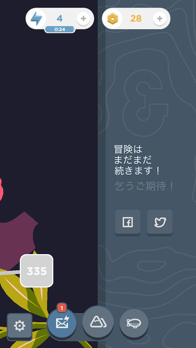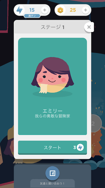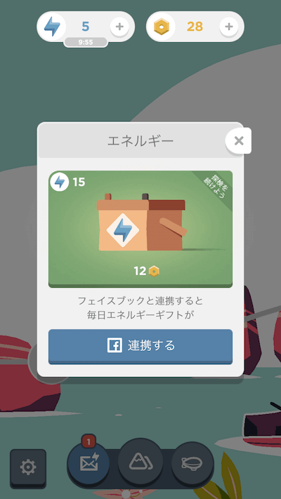 ゲームをプレイするために必要なエネルギーはステージクリアすると報酬としてもらえたり、10分に1回復しますので時間をおけば回復しています。またそれ以外でもFacebook連携でもらえたりしますので、ぜひFacebook連携をしましょう。