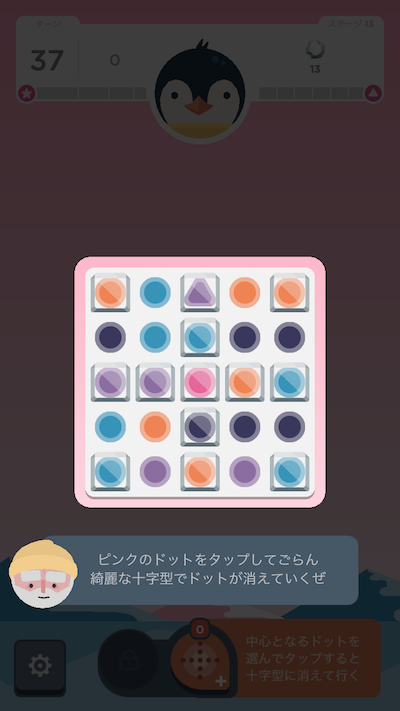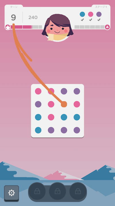 ステージ毎にドットの色でいくつ集めるという指定個数があるので、その個数を目指してドットをつなげていきます。もちろんドットは2つつなげても、連続で3つつなげても、ドットが横縦でつながっている限りいくつつなげてもOKです! ただし斜めにはつなげられないので、そこだけ注意しましょう。 またゲーム自体に制限時間はありませんが、画面左上の数字がターン数になっています。自分の行動回数がターン数を上回るとゲームオーバーですが、制限時間がないのでじっくり考えてプレイしましょう。そういう意味でもとてもスローペースでじっくり楽しめるゲームとなっています。