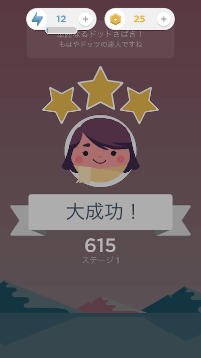 目標個数のドットをあつめるとステージクリアです!最初のステージはチュートリアル的な意味合いがあり、簡単にクリアできます。そこでドッツのコツをつかみましょう!