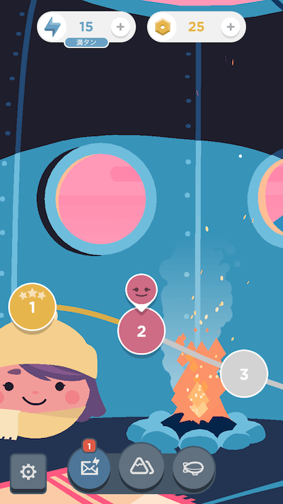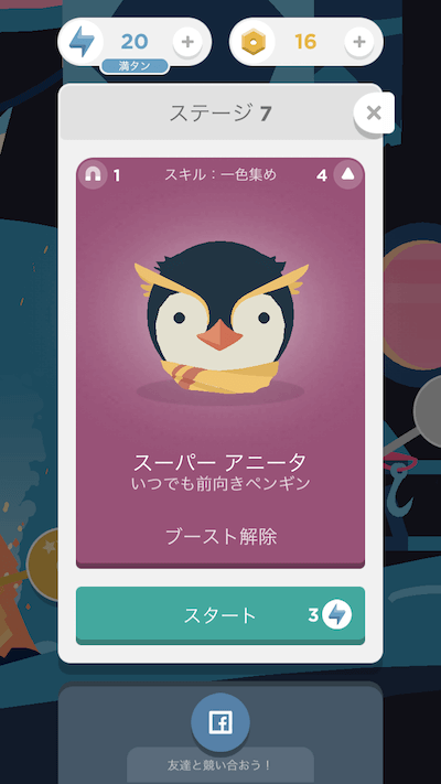ゲームはステージ毎に別れており、ステージクリアを目指してプレイしていきます。ステージをクリアすると次のステージで遊べます。またゲームを遊ぶには「エネルギー」が必要になります。エネルギーがなくなったらプレゼントとして貰えたり時間をおいて回復させましょう。 「スタート」ボタンでエネルギーを消費して、ゲーム開始です!
