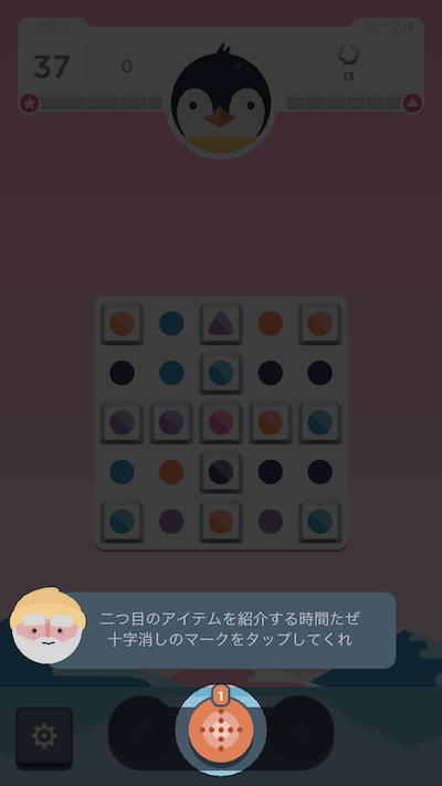 ステージをすすめていくと2つ目のアイテムが開放されます。十字消しのアイテムは選択した箇所を中心として十字にドットを消してくれるアイテムです。
