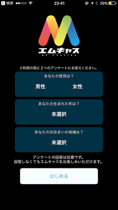 「性別」「生まれ年」「住まいの地域」についてのアンケートです。回答は任意でアンケートに答えないといけないという訳ではないので、アンケートに答えたくない人は「はじめる」ボタンからエムキャスをスタートしましょう!