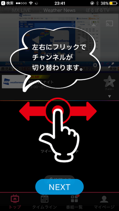 初回起動時に簡単なチュートリアルが流れますので大体の使い方はチュートリアルで把握できます。ここでは番組の切り替えはフリックで行えるようです。「NEXT」を押して次のチュートリアルを見ましょう。