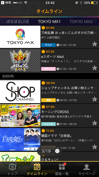 タイムラインでは一日の番組の流れについて時系列で番組ごとに確認することができます。
