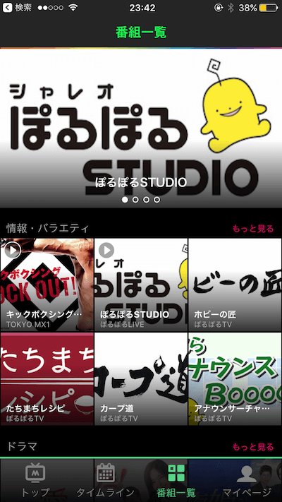 アプリの下部にメニューがあり、 ・トップ ・タイムライン ・番組一覧 ・マイページ とそれぞれ画面を切り替えることができます。