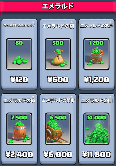 エメラルドはショップで購入ができます。ショップで購入するというのは無課金者にとっては無縁ですが、課金してクラロワを楽しみたい!早く強くなりたり!といった方にはおすすめです。