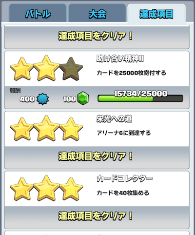 クラロワの「達成項目」をクリアすることで、経験値とエメラルドを入手することができます。難しい達成項目ほど大量のエメラルドが入手できます。