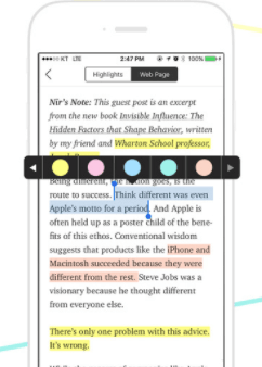テキストを選択すると「コピー」などメニューが表示されますが、そこに「黄色」「ピンク」「水色」などの○のメニューが登場します。これをタップすることでその色のマークがつくようになります。マークは好きなだけ行えますし、色分けも自由自在です! 自分が気になる文章やワードをマーキングして、ハイライトさせましょう。