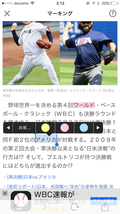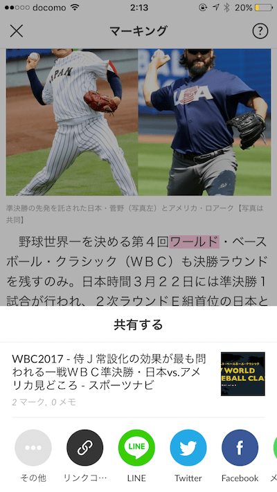 LINER側で記事を受け取れますので、その後にマーキングしていく流れとなります。あとはWEBページと一緒でマークしたり、シェアしたり自由です。
