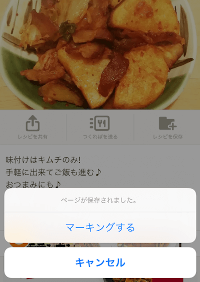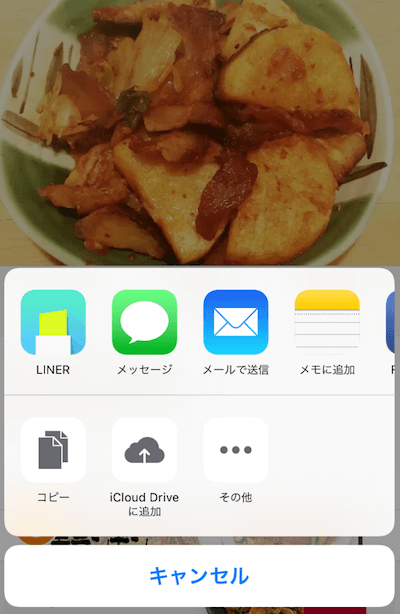例えばcookpadのアプリのレシピに対して、マークをしたい場合は「レシピの共有」をタップします。すると選択肢にLINERが出てきますので、こちらからLINERアプリに対してシェアをします。
