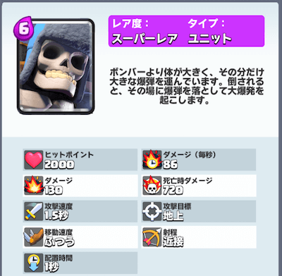 巨大スケルトンについての情報をまとめていきます。巨大スケルトンは比較的序盤で手に入るスーパーレアカードで何と言っても死亡時に落とす爆弾がめちゃくちゃ強力なやつです。1,000近くダメージ入りますw 一方でコスト6と大きく、単体の攻撃力はそれほど強くありません。巨大スケルトンの最大の特徴である、死亡時ダメージを上手く使ったおすすめデッキや、巨大スケルトンに毎回やられている方向けの「巨大スケルトン対策」についてまとめていきます。