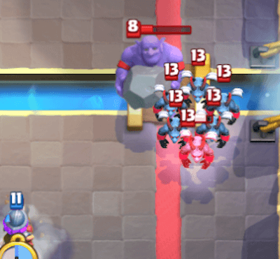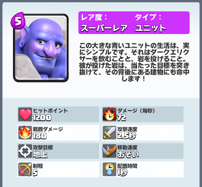 範囲攻撃はスケルトンの群れなどの小粒のユニットを踏み潰し、バーバリアンなどのHPがそこそこある集団のユニットも押し戻してタワーに近づけさせないなど防御でも活躍するユニットとなっています。
