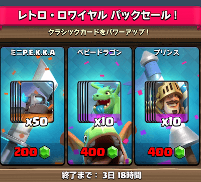 また同時にレトロ・ロワイヤル・パックセールも開催されています。レアカードやスーパーレアカードで同じカードを大量にゲットできるチャンスですので、目当てのカードがあれば買ってもいいかもしれません! なんだかんだレトロカードも使えるカードが多く、デッキの主力をはることも多いです!