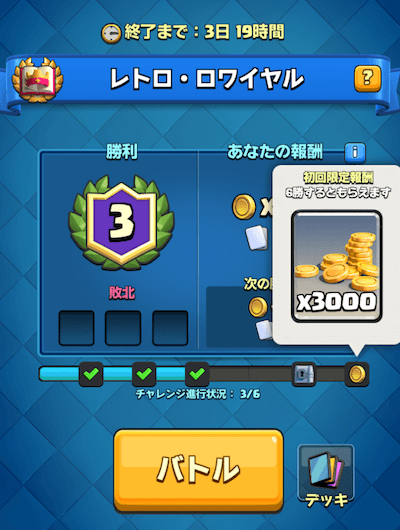 最近のイベントの報酬は一定の勝利数毎に宝箱をあけられます。特に1勝すれば、エメラルドをゲットできるので、参加費無料の初回はぜ必ず参加しましょう!お得です! 6勝で3,000ゴールドもめちゃくちゃおいしい!