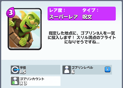 クラロワのカード「ゴブリンバレル」は狙った地点にゴブリン3体を出現させるスーパレアカードの呪文です。