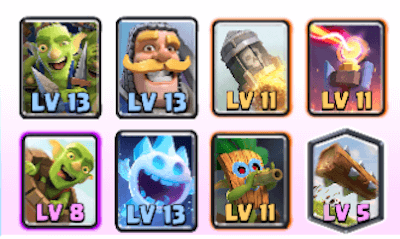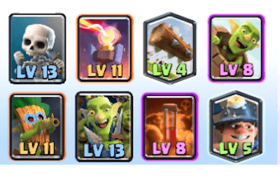 ゴブリンだらけのデッキですw ゴブリンはザップでの防御で瞬殺されますが、ゴブリンバレルとゴブリンギャングの両方がいることでどっちかはザップを免れられます。