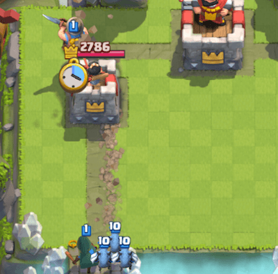ディガーを盾にアサシン ユーノで一気にタワーまでの距離をつめて攻撃をします。ダッシュ速度がプリンスよりも遥かに早いので、タイミング的に遅く出してもいいくらいです。 敵も大群系のカードを使ってアサシン ユーノを止めに来る可能性もありますので、ガーゴイルなど大群を処理しやすいユニットや呪文などでサポートしましょう。